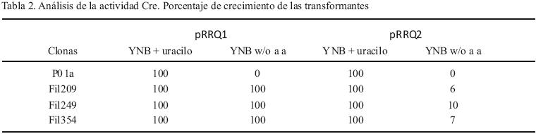 Transformación de las levaduras. Las levaduras (P01a, Fil209, Fil246 y Fil354) fueron sujetas a un ensayo de transformación por electroporación con el plásmido replicativo pRRQ2 y pRRQ1 como control negativo (Vector sin Cre, Figura 1). La preparación de las células electrocompetentes, se hizo conforme a lo establecido por Becker y Guarente (1991), donde 50 µl de células competentes fueron mezcladas suavemente con 500 ng del plásmido pRRQ2 y trasferidas a un electroporador (Jouan GHT 1287). Se aplicó un pulso eléctrico de 1.5 kV, 200 Ω. y capacitancia de 25 µF. Después del choque eléctrico, 1 ml de YPD suplementado con 1 M de sorbitol se adicionó a la suspensión celular y se mezcló suavemente, posteriormente se distribuyó en una placa con medio de cultivo YNB sin aminoácidos y adicionado de uracilo. Se recuperaron 100 transformantes de cada cepa, se multiplicaron en el medio YNB adicionado de uracilo y se almacenaron a 80 °C.
