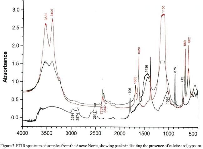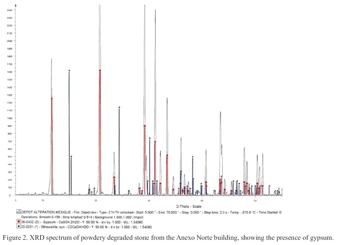 The presence of sulfur in these powdery samples was unexpected, although a similar phenomenon had been noted at other Mayan sites located in unpolluted countryside (OrtegaMorales et al., 2005). This indicated that some of the limestone had been converted into gypsum (CaSO42H2O) and this was confirmed by XRD (Figure 1). Gypsum is not unusual in urban sites, but the source of the sulfur in this countryside situation is unknown, although cartographic data shows that well water from near by locations contains significant amounts of sulfates.