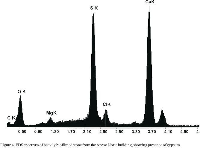 FTIR (Figure 2) confirmed that calcite was present in the undegraded and heavily biofilmed stone (strong bands at 1432cm1, 872cm1 and 708cm1, Negrotti et al., 1996) and that the reduction in this component in the powdery stone was due to its conversion into gypsum (bands at 1622cm1, 1140cm1, 1120cm1, 671cm1 and 603cm1). The presence of gypsum was confirmed by EDAX (Figure 3). GómezAlarcón et al. (1994) also noted a diminution in calcium content, with the formation of gypsum, in a degraded limestone monument in Spain.