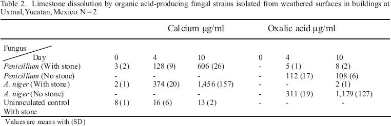 Deteriorated limestone from Mayan buildings in Yucatan, Mexico, was analyzed with scanning electron microscopy (SEM) and microprobe with energy dispersive Xray analysis (EDAX), Xray diffraction (XRD) and FourierTransformed Infrared Spectroscopy (FTIR). Changes in surface chemical composition, caused by the biofilm layer and the conversion of calcite into gypsum, were demonstrated. Representative fungi include Aspergillus, Penicillium, Fusarium and Paecilomyces. Strains of Aspergillus niger and Penicillium sp., were selected for their ability to produce acidic metabolites. Both fungi excreted organic acids when incubated; ion exchange chromatography identified these acids as gluconic, succcinicmalic (coeluted) and oxalic. A. niger, the most active acid producer, also excreted citric acid. When grown in the presence of limestone coupons, calcium release from the mineral matrix paralleled the production of oxalic acid. However free calcium was considerably lower in filtrates from limestone couponcontaining culture, suggesting its complexation. SEM and EDAX confirmed that calcium oxalate crystals developed on the surface of the stone coupons. The results show that organicacidproducing fungi may contribute to the deterioration of limestone monuments.