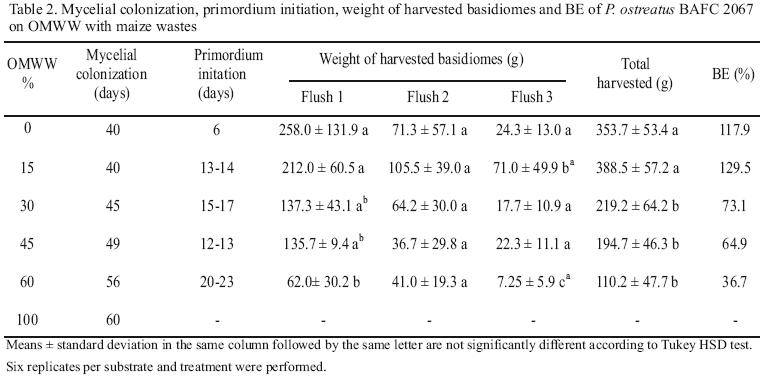 According to yields obtained in first and second flush on garlic wetted with different percentages of OMWW, it could be possible utilizing higher percentages of OMWW without harvesting the third flush. Kalmis and Sargin (2004) obtained only 05.7% of basidiomes in the third flush of Pleurotus cornucopiae var. citrinopileatus in a cultivation on wheat straw and OMWW, and 6.59.2% of Pleurotus sajorcaju; we obtained 1226 % for garlic and 618 % of the total yield for maize wastes. In general, better BEs were obtained in the present work with P. ostreatus, including the BE reached with the controls.