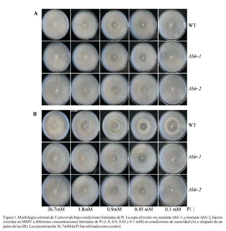 Los eventos moleculares asociados a la conidiación inducida por luz en Trichoderma están regulados por el complejo formado por las proteínas BLR-1 y BLR-2, donde la primera actúa como fotorreceptor y ambas tienen actividad como factor de transcripción. Las cepas mutantes nulas en los genes blr de T. atroviride pierden la capacidad de responder al estímulo luminoso y son consideradas "mutantes ciegas". La limitación de algunos nutrientes esenciales también desencadenan la conidiación en T. atroviride. La influencia de bajas concentraciones de fosfato inorgánico (Pi) en el medio de cultivo sobre la fotoconidiación de la cepa silvestre y las mutantes blr de T. atroviride fue probada. Todas las cepas utilizadas mostraron el desarrollo de conidias bajo concentraciones limitantes de Pi (hasta 0.1 mM) en ausencia de la luz. Los resultados indican que la limitación de Pi es un factor desencadenante del proceso de conidiación a través de una vía independiente a la mediada por las proteínas BLR.