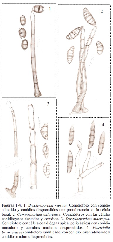 Observaciones: La formación de esporas a partir de pequeños pedicelos cilíndricos que surgen de las células conidiógenas es uno de los caracteres distintivos del género Brachysporium, la diferenciación morfológica a nivel de especie se basa en la forma, número de septos y color de los conidios. El ejemplar estudiado se ajusta a la morfología y dimensiones de la especie tipo.