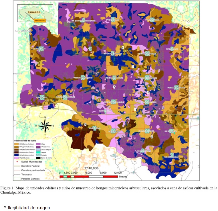 Los hongos micorrícicos arbusculares (HMA) son organismos biotróficos obligados que al asociarse al sistema radical estimulan el crecimiento y desarrollo de las plantas y mejoran su nutrición, principalmente por la exploración de mayor volumen de suelo que facilita a la planta la absorción de nutrimentos de baja movilidad y agua (Reis et al., 1999; Rillig, 2004). Este beneficio potencial ha motivado el comercio de biofertilizantes a base de HMA y Azospirillum brasilense en la región, destinados a la caña de azúcar. Algunos estudios revelan que la colonización espontánea de raíces por HMA es aleatoria (Smith y Smith, 2011) y dado que el manejo de los suelos en el cultivo de la caña es intensivo (paso de cultivadora de ganchos, aplicación de herbicidas, insecticidas y fertilizantes), este manejo puede tener un efecto adverso sobre la colonización micorrícica (Azevedo, 2008). Por ello se consideró necesario determinar si la simbiosis micorrícica ocurre en la caña de azúcar cultivada en el área de estudio; esta información permitiría usar eficientemente los biofertilizantes en dicho cultivo. Por lo anterior, los objetivos de este estudio fueron determinar que especies de HMA están presentes en la zona, cuantificar la colonización micorrícica de raíces de caña de azúcar y estimar la densidad de esporas en los suelos cañeros de la Chontalpa, Tabasco.