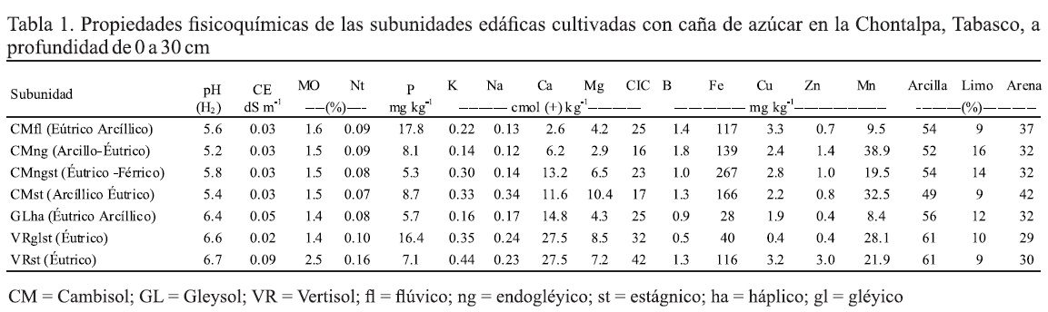Los Vertisoles son de alta fertilidad y de pH neutro, el resto de los suelos tienen mediana fertilidad y pH moderadamente ácido (Tabla 1). La mayoría presenta pobre contenido de materia orgánica (<2%) debido a la quema de los cañaverales antes de la cosecha, esto coincide con un pobre contenido de Nt. El fósforo se clasifica como medio a rico (>11 mg kg-1), el potasio es de bajo a medio (0.3 a 0.6 cmol (+) kg-1). La conductividad eléctrica y el contenido de sodio son indicativos que no existe salinidad en estos suelos. Respecto al calcio, el Cambisol flúvico (Éutrico arcíllico) presenta contenido bajo, el Cambisol endogléyico (Arcíllico éutrico) medio y el resto se clasifica como alto. El contenido de magnesio se clasifica como medio a alto (>3.0 cmol (+) kg-1). El boro es bajo en el Gleysol háplico (Éutrico Arcíllico) y Vertisol gléyico estágnico (Éutrico). El cobre es bajo en el suelo Vertisol gléyico estágnico (Éutrico). El zinc es adecuado en los suelos Cambisol endogléyico estágnico (Éutrico -Férrico) y Vertisol estágnico (Éutrico) pero en las otras subunidades de suelo es deficiente. Por el contenido alto de arcilla, la textura de estos suelos se clasifica como arcillosa, lo que les confiere alta capacidad para retener humedad (Salgado et al., 2013b).