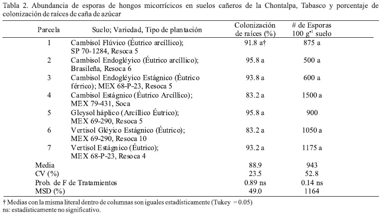 La simbiosis entre HMA y la caña de azúcar ocurre espontáneamente en todas las subunidades de suelo de la zona de la Chontalpa, Tabasco; la media de colonización de raíces es 89%, con una máxima de 96 % en el Cambisol endogléyico (Éutrico arcíllico) y una mínima de 83% en los suelos Cambisol estágnico (Éutrico arcíllico) y Vertisol gléyico-estágnico (Éutrico).