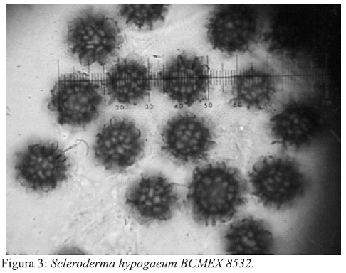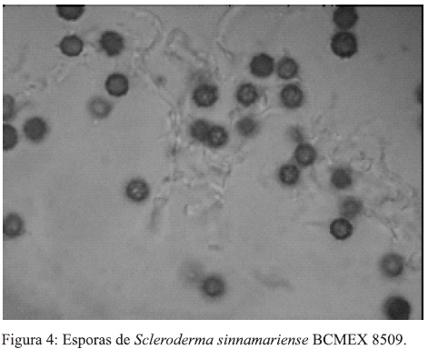Observaciones. El material estudiado concuerda con el descrito por Guzmán (1970). Los cuerpos fructíferos de esta especie se caracterizan por el color rojo oscuro del δ peridio al reaccionar con KOH 5%, por sus esporas fuertemente ornamentadas y su retículo evidente tanto en KOH como en reactivo de Melzer. Se diferencia de Scleroderma sinnamariense porque esta presenta esporas y más pequeñas, ligeramente ornamentadas. Guzmán (1970) mencionó que esta especie es próxima a S. fuscum pero se diferencia de esta última en el diámetro de la medida de las esporas (15-18 μπι). S. hypogaeum, se registra por primera vez para Baja California.