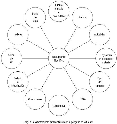 Tal y como se especifica en la Figura 1 (página derecha), los parámetros que se deben tener en cuenta, siguiendo las agujas del reloj, son los siguientes: fuente primaria o secundaria, autoría, actualidad, ergonomía, tipo de usuario, estilo, bibliografía, conclusiones, prefacio o introducción, guías de uso, índices, y punto de vista. Son doce parámetros o principios cuya mención no sigue un criterio de prioridad específico ni tampoco tiene como objetivo ofrecer una enumeración completa. En este trabajo explicarán con más detalle cinco de los parámetros enunciados: la autoría, el punto de vista, la ergonomía, la bibliografía, y los índices. Se trata de una selección que tiene la intención de convertirse en guía de uso común en el ámbito académico y por parte de la mayoría de los humanistas. Prestigiosos intelectuales avalan esta selección, si bien cabe decir que cada uno de ellos lo hace desde su particular perspectiva: López Yepes (1996), Ayuso y Martínez (2005), Cordón (1998) o GorbeaPortal (1994), son autores que se han dedicado a estos temas con estudios de gran profundidad.