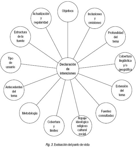 La Figura 3 (pagina derecha) enuncia los principales requisitos que deberían encontrarse en un prefacio, introducción, guía de uso o presentación de la obra fuente que deseamos consultar, y que podrían satisfacer la necesidad informativa en cuanto al punto de vista de la fuente. Siguiendo las agujas del reloj, para evaluar los puntos de vista, habría que tener en cuenta los siguientes trece puntos: objetivos; inclusiones y omisiones; profundidad del tema; cobertura lingüística y/o geográfica; extensión del tema; fuentes consultadas; ropaje ideológico, religioso, cultural y social; cobertura y límites; metodología; antecedentes del tema; tipo de usuario; estructura de la fuente, y actualización y regularidad.