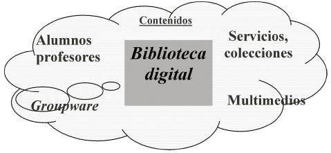 La BD es un espacio educativo por excelencia, un lugar donde se entrelazan la información y los conocimientos; un medio para que el trabajo colaborativo fructifique; un sitio en el que se encuentran recursos informativos, contenidos didácticos y los usuarios, además de los "bibliotecarios digitales"; es decir, el personal profesional que en un ámbito virtual cumple las funciones de un bibliotecario tradicional en la institución análoga (Biblioteca Presencial o BP), conjunto que genera nuevos conocimientos en la interacción entre los medios y la información.
