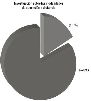 Un aspecto al parecer olvidado de la BD es la investigación. En un estudio llevado a cabo por Marisol Ramírez, del Instituto Tecnológico y de Estudios Superiores de Monterrey (ITESM), campus Juárez, sobre la forma en que se usa la tecnología en la educación, observa la autora que la mayoría de los programas de educación a distancia no fomentan esta actividad tan importante dentro de la educación superior. Una cifra alarmante es que el 83% de esos programas no efectúa investigación, en tanto que sólo el 17% sí la considera como actividad de aprendizaje o como parte de la formación de los estudiantes a distancia.6