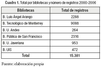 • Idiomas a incluir. Se eligieron el español, el inglés y el portugués. Las colecciones de bibliotecas seleccionadas. Fueron las tres siguientes: colombianas (muestreo del año 2000 de en adelante): la Universidad de los Andes; la Universidad Javeriana y la Universidad Industrial de Santander. Dos (2) extranjeras (muestreo del año 2000 de en adelante): el Instituto Tecnológico de Monterrey y la Biblioteca Pública de San Francisco USA.