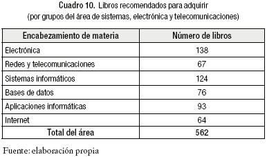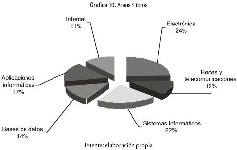 El Cuadro 10 y la Gráfica 10, presentan el resumen en las seis áreas de los libros recomendados a la BLA para su adquisición.10 En la gráfica se puede apreciar el equilibrio que se quiso tener al recomendar libros que contienen conocimiento actualizado.