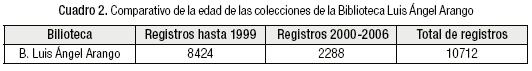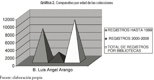 Si observamos el cuadro Núm. 1 y la gráfica 1, vemos que la Biblioteca del Tecnológico de Monterrey posee el 59% del total de registros existentes en las seis bibliotecas, y que la Biblioteca Luis Ángel Arango tiene un número muy similar al que posee la Biblioteca Pública de San Francisco; algo que es muy significativo para la BLA.