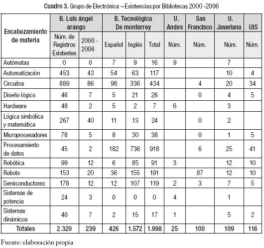 En el cuadro 3: Grupo de Electrónica, se pueden observar las colecciones que tiene cada una de las bibliotecas participantes en el estudio en el área de electrónica.