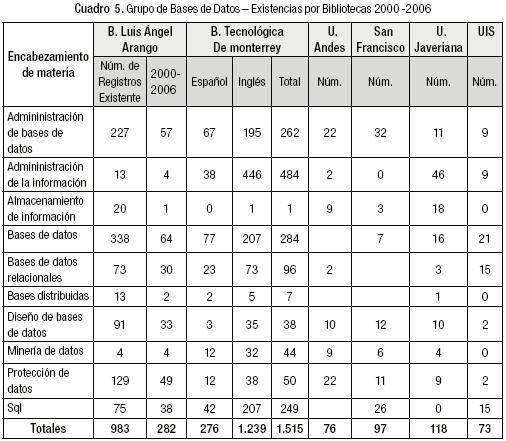En cuanto a las Bases de Datos, en el Cuadro 5 se aprecia una coincidencia del cien por ciento en cuanto a los encabezamientos de materia, entre la biblioteca BLA y la del Tecnológico de Monterrey. También es apreciable la diferencia en las existencias de las colecciones en el área, dado que la colección que posee la BLA, sólo representa el 13% del total del grupo, y la de la Biblioteca del Tecnológico de Monterrey representa el 71% del total de los registros de las seis bibliotecas objeto del estudio. Asimismo observamos que hay claras diferencias en cuanto al número de registros entre la BLA y la biblioteca del Tecnológico de Monterrey, en los encabezamientos de Bases de Datos, Administración de Bases de Datos, Administración de la Información y SQL.