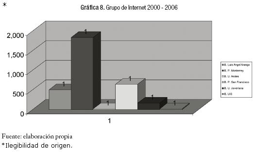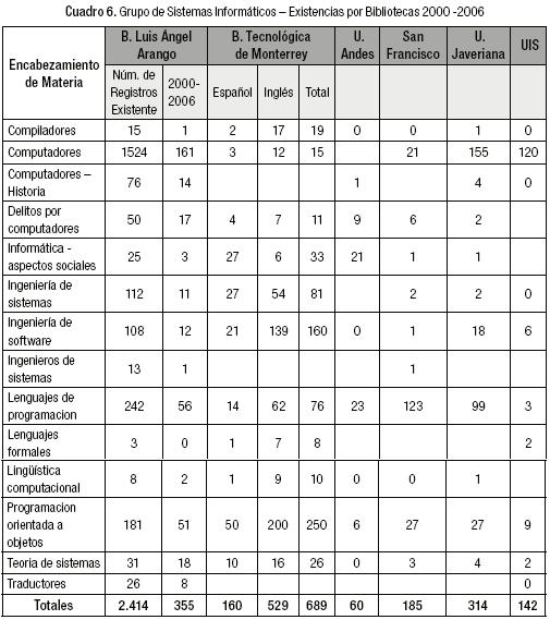 Con respecto al Grupo de Sistemas Informáticos (Cuadro 6), podemos observar que se conserva la tendencia, hacia un mayor crecimiento de la colección del año 2000 en adelante en la Biblioteca del Tecnológico de Monterrey, frente a la BLA. En el mismo sentido, en esta área, la Biblioteca de la Universidad Javeriana tiene un crecimiento comparable con la colección que posee la BLA.