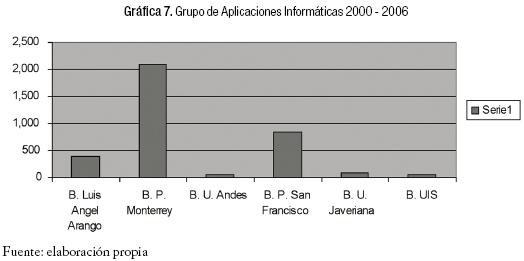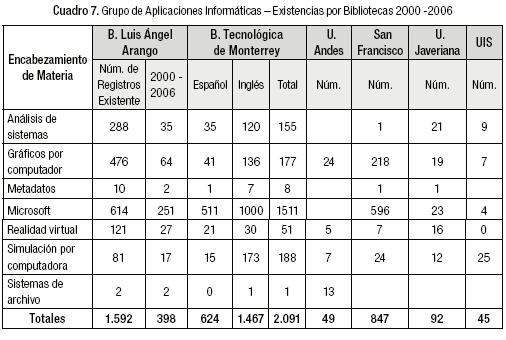 En el Cuadro 7 del grupo de Aplicaciones Informáticas se puede advertir que es donde hay más desequilibrio entre las dos bibliotecas del exterior con la BLA, el cual se acentúa más todavía para las bibliotecas de las universidades colombianas.