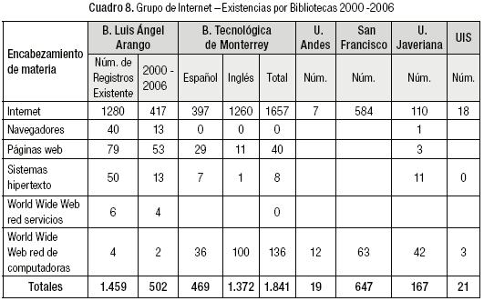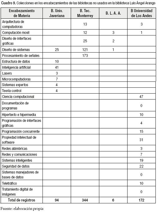 En el Cuadro 9 se puede observar que la Biblioteca de la Universidad Javeriana tiene 94 registros del año 2000 en adelante en siete encabezamientos de materia; la Biblioteca de la Universidad de los Andes tiene 172 registros en quince encabezamientos de materia, (pero señalemos que en tres de ellos no hay ningún registro a partir del año 2000 en adelante) la Biblioteca de la UIS tiene seis registros en tres encabezamientos de materia y la Biblioteca del Tecnológico de Monterrey posee 344 registros en cinco encabezamientos de materia.
