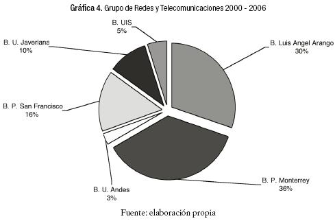 En el Cuadro 4 del grupo de Redes y Telecomunicaciones, podemos observar las colecciones que tienen en el área cada una de las bibliotecas participantes. El mismo cuadro facilita el análisis de las existencias de registros por cada uno de los encabezamientos de materia.