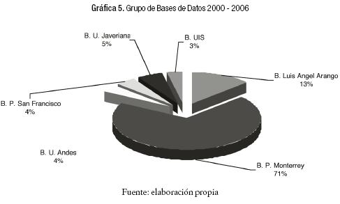 D. Además se contó con la colaboración de las bibliotecas de la Universidades de los Andes y de la Javeriana; ambas universidades proporcionaron sus archivos en cada uno de los encabezamientos establecidos. Agregaron además, con sus respectivas colecciones, los encabezamientos de materia que en las áreas de estudio tenían sus bibliotecas y que no estaban contemplados en el listado remitido por el investigador. Estas bases de datos se analizan en el apartado tres de este trabajo.