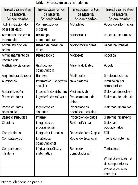 A. Se realizó un análisis previo de los encabezamientos de materia, que las bibliotecas de Bogotá comprometidas en el estudio utilizaban en las áreas temáticas seleccionadas. Con el producto se elaboró una lista única de encabezamientos de materia que se sometió para su decisión y aprobación a la BLA. Analizada internamente la lista, se llegó a la decisión de seleccionar 62 encabezamientos (Tabla I). Encabezamientos que de hecho se constituyeron en el parámetro principal para el desarrollo del estudio.