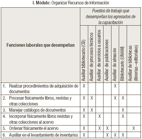Al terminar cada módulo de aprendizaje los egresados de la capacitación serán competentes para realizar diversas funciones laborales que tienen relación con los diversos puestos de trabajo en que pueden desempeñarse. En las siguientes tablas se detalla la relación entre las funciones laborales correspondientes al primer módulo y los puestos asociados a la capacitación.