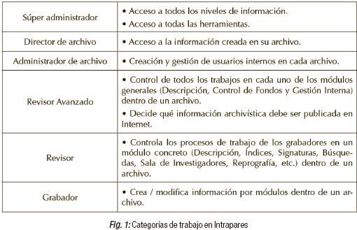 Comprobamos que existen dos maneras de acceder a la aplicación: un acceso general a través de Internet, para todos los internautas interesados, y un acceso restringido a los trabajadores que colaboran en la aplicación PARES, a través de una intranet. A este último se le denomina Intrapares, se gestiona mediante un módulo que administra a todo el personal que trabaja en él, y su acceso se realiza mediante un código de usuario y una contraseña. El usuario de Intrapares trabaja y accede a los diferentes niveles y estados de la masa archivística en función de la categoría que tenga asignada (Figura 1).