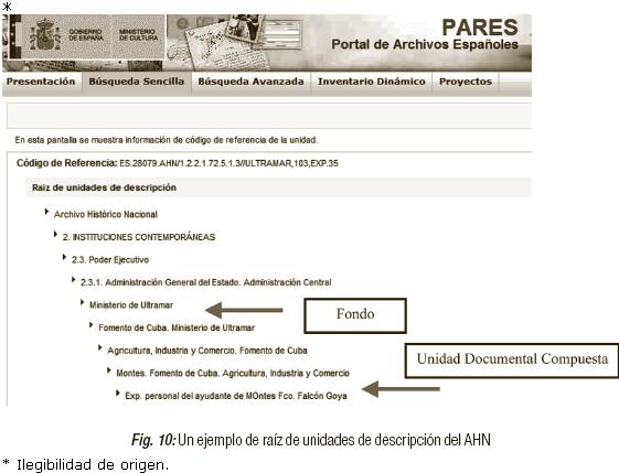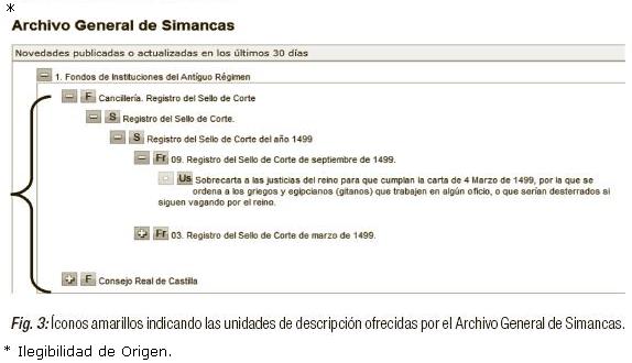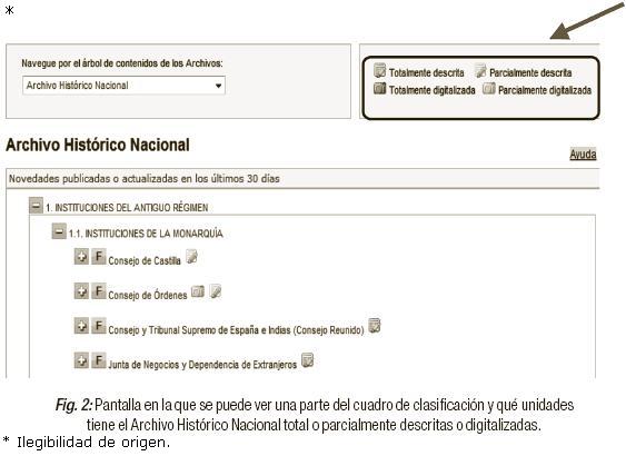 El portal ofrece un inventario de cada uno de los once archivos que constituye PARES. Cuando éste se muestra, observamos las unidades que tienen total o parcialmente descritas o digitalizadas, lo podemos comprobar en los iconos que muestra cada unidad. Además, para facilitar la interpretación de los iconos añadidos, la aplicación ofrece una leyenda (Figura 2).