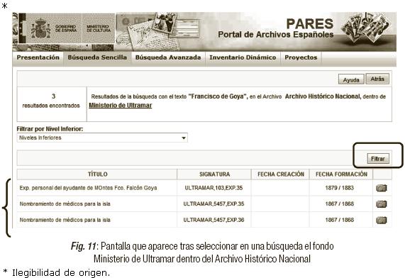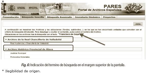 Tras una consulta debemos comprobar que la interfaz identifica el nombre de las bases de datos de donde ha extraído los resultados. Como sabemos, PARES es la herramienta que le da soporte a once bases de datos de archivos, y por lo tanto al mostrar los resultados indica a qué base de datos de cada archivo pertenecen (Figura 6).