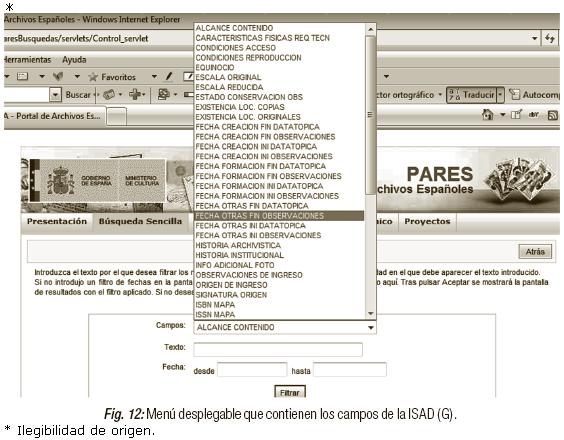 Vemos que la aplicación permite filtrar por campos de la ISAD (G) (Figuras 11 y 12)
