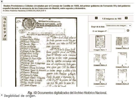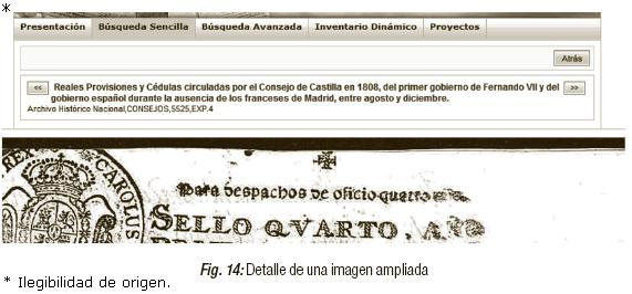 Para acceder a las imágenes del "Inventario dinámico" no es necesaria la descarga de un programa específico, y podemos saber, antes de abrir las imágenes, qué series están total o parcialmente digitalizadas a través de un icono representado mediante una cámara de fotos. Cuando ejecutamos una búsqueda sencilla también podemos marcar la opción de obtener registros digitalizados; de este modo obtenemos todos aquellos que estén a texto completo, y para ver el documento también tenemos que dar click sobre el icono de la cámara de fotos. Una vez que marcamos sobre el icono, la aplicación muestra una visión general. En el margen derecho aparece un índice con el número de imágenes que componen ese documento y nos permite navegar a través de ellas (avanzar, retroceder, seleccionar del listado de imágenes, volver a inicio etc.), (Figuras 13 y 14). Como podemos ver en la Figura 13, la parte izquierda muestra la primera hoja de ese documento ampliada. Esta imagen, que encontramos al margen izquierdo, podemos obtenerla ampliada mediante zoom, ajustaría a la anchura de la ventana, cambiar la polaridad, rotar la imagen 90° grados a la izquierda o a la derecha, mejorar el contraste de la imagen e imprimirla, todo ello con la ayuda de la barra de herramientas que figura en el margen superior izquierdo.