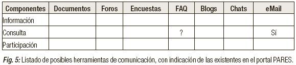 Las dudas o sugerencias que le puedan aparecer al usuario una vez que esté trabajando con algún sistema, pueden solucionarse o presentarse mediante herramientas de contacto o de ayuda que permitan ofrecer información adicional para continuar trabajando con cualquier sistema. Estas herramientas pueden ser foros, chats, blogs, email, Faq, Tutoriales, etc. (Figura 5). Sin embargo, de todas las mencionadas, la única que permite al usuario resolver sus dudas es el email. Hicimos una consulta sobre "cuántos registros contenía la base de datos Pares" a principios del mes de Agosto de 2008 y contestaron el 24 de Septiembre de ese mismo año. Sobre formación de usuarios no hemos encontrado nada. Según la ponencia presentada por Alfonso Sánchez (2008), se establece que durante el año 2007 PARES ha ido estableciendo un sistema de contacto con los clientes externos mediante diferentes métodos con varías líneas de acción, una de ellas es el establecimiento de FAQ (Lista de consultas más frecuentes). Sin embargo, no hemos encontrado está lista de consultas frecuentes en la web.