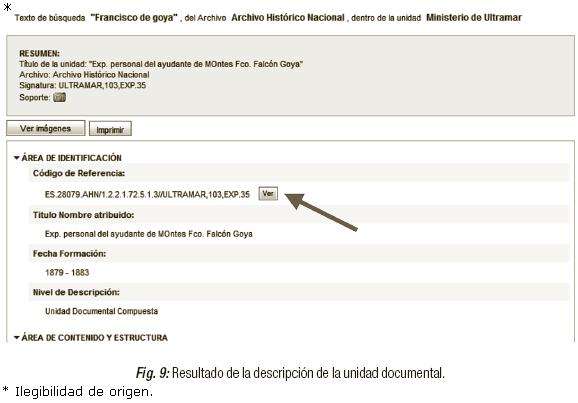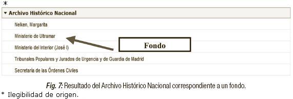 En el siguiente caso (Figura 7) vemos que uno de los resultados obtenidos corresponde a un fondo, pero si pinchamos sobre él la aplicación no nos proporciona la descripción de éste, sino que nos conduce a la unidad documental simple que está dentro de ese fondo (figura 8). Sin embargo, al pinchar en el enlace superior de la pantalla "Ministerio de Ultramar", sí se muestra la descripción del fondo y se da la opción de ver además la descripción de las secciones inferiores (Iª división y serie). Esto significa que está disponible, pero sólo se usa si se la conoce. Creemos que sería más fácil para el usuario que el sistema ofreciera una ayuda, o comentario en donde se explicara esto.