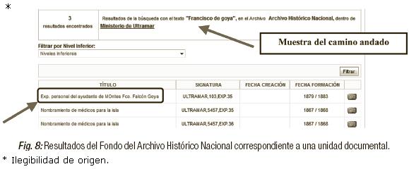 La interfaz muestra los resultados estructurados en un listado, proporcionado en la parte superior información sobre el término de búsqueda empleado (Figura 6). Conforme vamos accediendo a los resultados, la aplicación deja reflejado una muestra del camino andado, dato muy útil para ubicar al usuario. Por ejemplo en la Figura 8, además del término de búsqueda empleado, indica el archivo y el fondo donde se han encontrado resultados que concuerdan con el término de búsqueda utilizado.