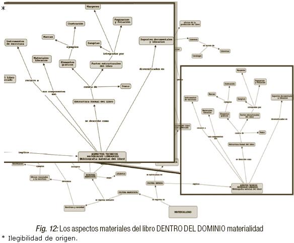 3. El tercer dominio, Materialidad, se refiere a muchos aspectos tangibles y de producción material relacionados con la lectura y la escritura. Por tanto, un buen concepto para ejemplificar la estructura sería el de los Aspectos Técnicos Materiales Librarías, que en el dominio se vería como en la Figura 12: