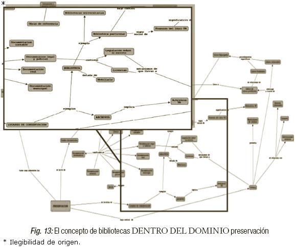 4. Y por último, el cuarto dominio, Preservación, se refiere a todo lo relativo a la conservación, organización y clasificación, es decir, a todo a lo que ayude & preservar el conocimiento; por lo que uno de los conceptos más importantes es el de Bibliotecas, representado en la Figura 13: