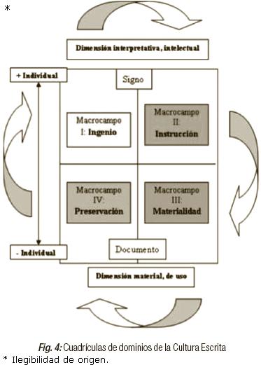 • El dominio inferior derecho se refiere a la Materialidad (Anexo III), lo que hoy llamaríamos "industria cultural". Se exploran elementos tales como el libro como objeto, los oficios de la cultura impresa o su público y su consumo. La dimensión económica siempre ha estado ahí, en la cultura escrita como tecnología y como valor de cambio, y siempre ha generado artefactos, tecnología y productos para su difusión y comercialización, en su caso.