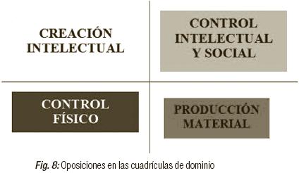 La complejidad de relaciones que se produce entre los cuatro campos se reduce a una serie de dualidades y ejes que podemos resumir de diferentes formas dependiendo de los atributos a los que se quiera dar relevancia o que se opongan entre sí, como veremos en el punto siguiente.