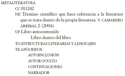 Ello naturalmente tiene su reflejo en la construcción del tesauro, en la creación de un Descriptor denominado METALITERATURA, el cual tiene las mismas relaciones que su homónimo dentro de la cuadrícula conceptual, coincidiendo en tanto en el Término Genérico como en los Específicos (Autor Oculto, Narradores, etc.)