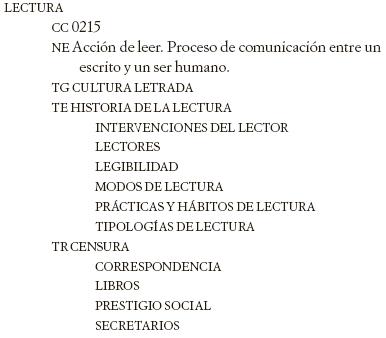 Al igual que en el caso anterior, muchos de los TE del Descriptor LECTURA en el tesauro son también subordinados en su representación gráfica en el dominio, como ocurre con Modos de Lectura, Lectores o Prácticas y Hábitos de Lectura.