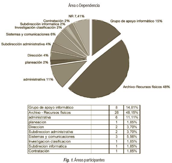 En relación con las áreas que participaron en el estudio, en la Figura 1 se identifican las diferentes dependencias a las cuales estaban vinculados los encuestados, lo que permite tener una mayor aproximación realista al conocimiento de un problema que tiene relación directa con toda la administración distrital. Aunque la mayoría de los encuestados estaban vinculados al archivo de la entidad, la naturaleza del trabajo de gestión documental unida al hecho de que la información es un activo, pone de relieve que se trata de un tema cuya responsabilidad es de todos los servidores y funcionarios del Distrito.