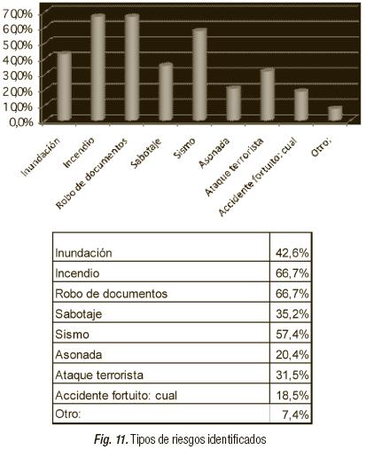 Una de las principales premisas para atender adecuadamente una situación de riesgo es la de contar con información apropiada, actualizada y oportuna. Sin información, la planeación ante eventuales situaciones críticas del negocio es ineficaz; esta situación se observa en las entidades que participaron en el presente estudio: en varios de los casos no existía claridad respecto de los riesgos reales a los que estaban expuestas tanto las entidades como los archivos; y aunque en general los encuestados tiene una idea acerca de los riegos y vulnerabilidades que los pueden afectar, no hay una evidencia real de tales riesgos.