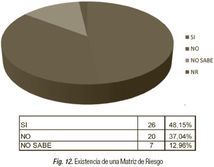 Sin embargo al indagar si las entidades cuentan con matrices de riesgo en el archivo como parte del MECI, Figura 12, el 48% de los encuestados afirmó contar con dicho instrumento; a pesar de lo cual sigue siendo alto el número de respuestas que señalaron no tener identificados los riesgos que pueden afectar el archivo de sus entidades, lo que se traduce en un aumento del riesgo de vulnerabilidad de la información puesta bajo la responsabilidad de los archivos del Distrito.