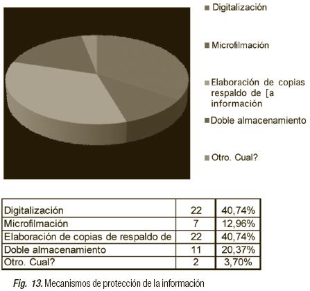 Finalmente, cuando se preguntó cuáles son los mecanismos utilizados por las entidades del distrito para proteger su información, Figura 13, la elaboración de copias de respaldo y la digitalización se señalaron como los más utilizados, lo cual está relacionado con las prácticas habituales seguidas por otras organizaciones en cuanto a la protección de la información electrónica de los sistemas de información; la microfilmación sigue siendo en la actualidad un procedimiento muy aceptado por las entidades para proteger la información física.