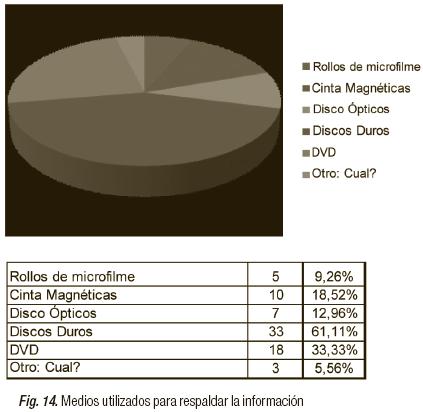 Por su parte, los discos duros y los DVD son los soportes más utilizados para almacenar las copias de seguridad o los respaldos de información; el microfilme, aunque se usa, no tiene la misma aceptación que los otros medios de almacenamiento. (Figura 14)