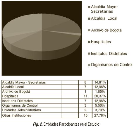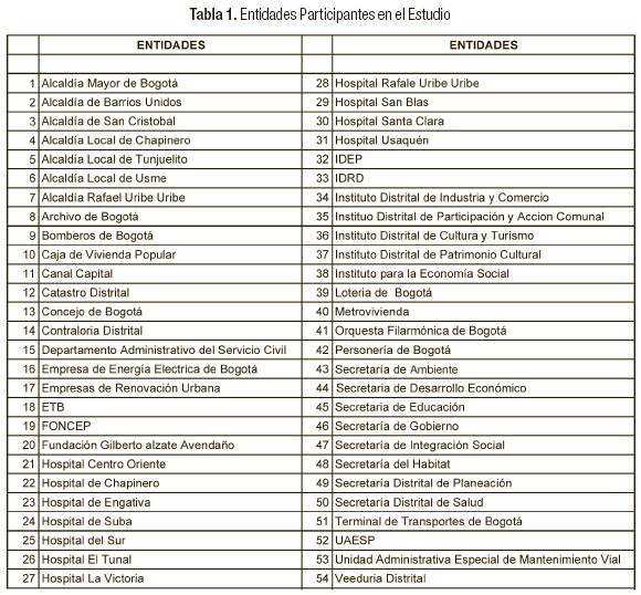La encuesta fue aplicada en 54 de las 92 entidades del Distrito, equivalente al 58,6% de la población; los encuestados pertenecían a diferentes dependencias del distrito (Tabla 1) y fueron seleccionados al azar entre los participantes a un taller realizado en el Archivo de Bogotá en el 2009. De esta forma se logró contar con una población heterogénea, con diferentes niveles de conocimiento y experiencia respecto al MECI y la gestión documental.