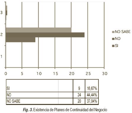 En relación con la pregunta Indique si su entidad tiene un Vían de Continuidad del Negocio, Figura 3, la mayoría de los encuestados (44%) respondió que sus entidades cuentan con dicho plan; un porcentaje menor (17%) respondió afirmativamente y un 37% dijo no saber. Al analizar las respuestas afirmativas se encontró que corresponden al personal de sistemas de las entidades del distrito, lo cual resulta lógico por cuanto tradicionalmente dichas áreas tienen una mayor conciencia sobre la necesidad de proteger los activos de información; este resultado está igualmente relacionado con la formación que reciben los ingenieros de sistemas en temas de seguridad de la información; además, es frecuente que de los planes de continuidad del negocio se encarguen las áreas de informática.