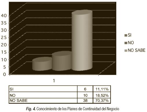 En cuanto a la pregunta ¿conoce usted los planes de continuidad del negocio de su entidad?, Figura 4, un 70,3% de los encuestados no respondió la pregunta; aunque estos resultados no son determinantes a primera vista, es claro que existe relación directa con las políticas y procedimientos que siguen las entidades del Distrito en cuanto a la protección de su información; adicionalmente los resultados obtenidos son un indicador de que las entidades o bien no divulgan adecuadamente las políticas de continuidad del negocio o que éstas sólo son conocidas por un número reducido de personas, entre las cuales no están incluidos los archivistas.