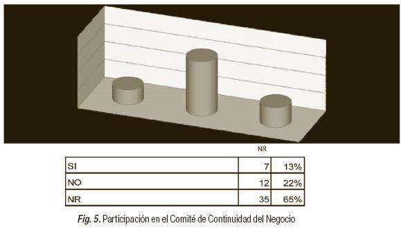 Otro dato importante del estudio se relaciona con la pregunta indique si usted o su dependencia participan en el comité de continuidad del negocio arrojó que solo un 22% de las áreas o personas participa en dicho comité (Figura 5). Aunque en general los resultados pueden atribuirse a la falta de divulgación del MECI, es probable que también se deba a que dichos comités no han sido conformados en todas las entidades del Distrito; sólo en algunos casos (menos de 9%) las respuestas mostraron que en dicho comité participan las áreas de apoyo informático, archivo y recursos físicos, las cuales por su propia naturaleza deben hacer parte del mismo en todas las entidades de la administración distrital.